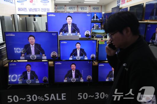 (서울=뉴스1) 박세연 기자 = 7일 오전 서울 용산구 전자상가에서 한 시민이 윤석열 대통령 대국민담화 및 기자회견 생중계 앞을 지나고 있다. 2024.11.7/뉴스1psy5179@news1.krCopyright ⓒ 뉴스1. All rights reserved. 무단 전재 및 재배포, AI학습 이용 금지.