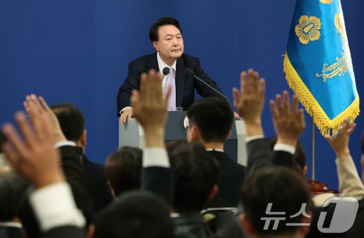 (서울=뉴스1) 송원영 기자 = 윤석열 대통령이 7일 서울 용산 대통령실 청사 브리핑실에서 열린 대국민담화 및 기자회견에서 취재진의 질문을 받고 있다. 2024.11.7/뉴스1