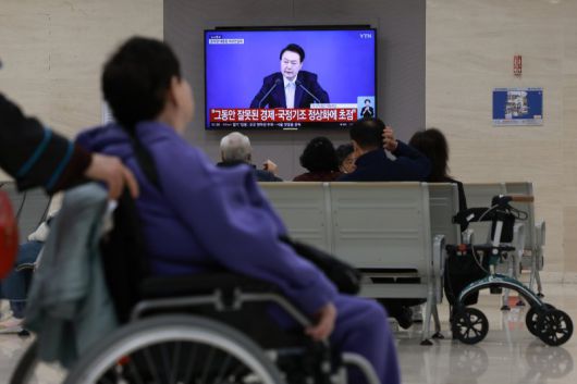 7일 오전 서울 시내 한 대학병원에 설치된 TV로 내원객들이 윤석열 대통령의 '대국민 담화 및 기자회견' 생중계를 시청하고 있다. 연합뉴스 |