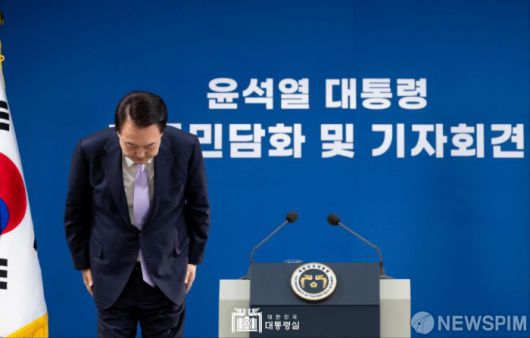 [서울=뉴스핌] 윤석열 대통령이 7일 서울 용산 대통령실 청사에서 열린 대국민 담화 및 기자회견에서 고개숙여 사과하고 있다.[사진= 대통령실]2024.11.07 photo@newspim.com 저작권자(c) 글로벌리더의 지름길 종합뉴스통신사 뉴스핌(Newspim), 무단 전재-재배포 금지