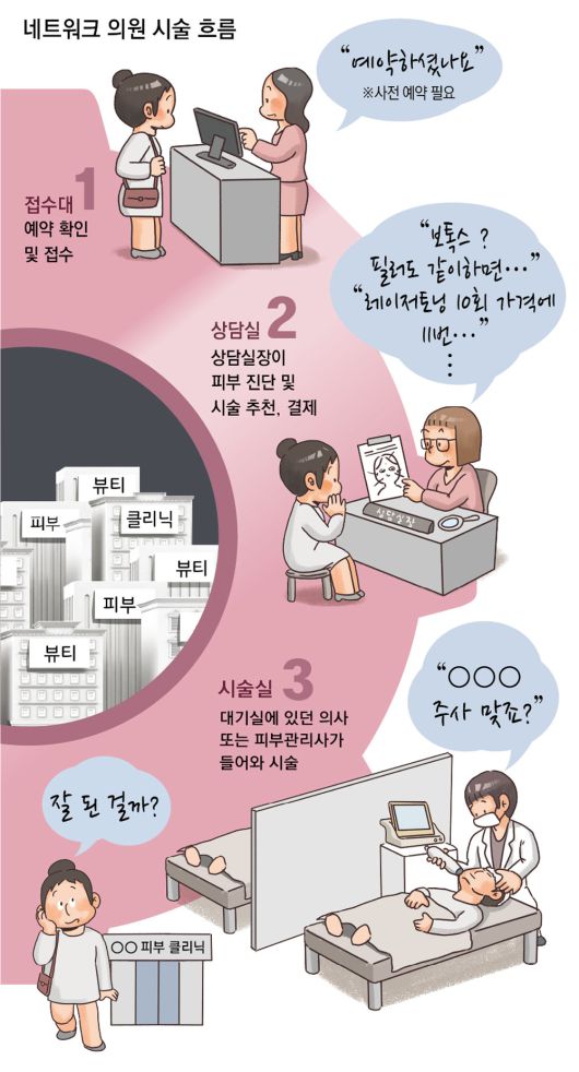 네트워크 미용의원에서 피부 진단과 시술 추천, 결제 등은 모두 상담실장이 맡는다. 의사는 상담실장으로부터 “1번 방으로 와 달라”는 식의 요청을 받고 간단한 확인을 거친 후 주사를 놓거나 시술을 한다. 의료기기가 아닌 경우는 피부관리사나 간호조무사 등이 시술을 맡으며 컨베이어 벨트처럼 효율적으로 움직인다.