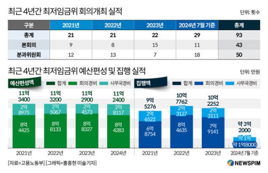 예산 편성액 중 2021년부터 올해 7월까지 실제 집행된 금액은 회의경비와 사무국경비가 각각 약 25억원, 약 7억2800만원 수준이다. 최저임금위는 지난 4년간 본회의와 분과위원회를 합쳐 총 93번의 회의를 진행했다. 회의 1회당 약 2700만원의 회의경비가 소요된 셈이다.