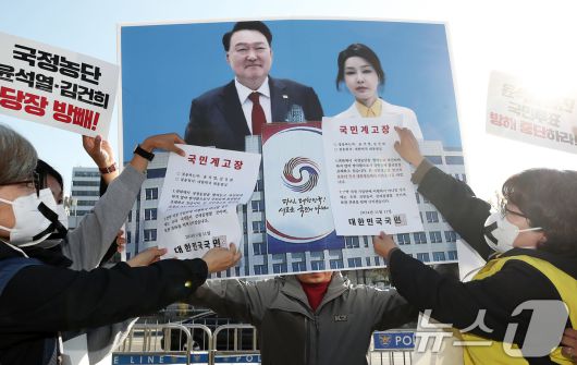 (서울=뉴스1) 오대일 기자 = 11일 오후 서울 용산 대통령실 앞에서 열린 '윤석열 퇴진 국민투표 방해 규탄' 기자회견에서 참가자들이 부경대, 전교조, 홈플러스, 서대문구 등에서 발생한 국민투표 방해 행위를 규탄하며 용산 대통령실에 계고장을 붙히는 상징 퍼포먼스를 하고 있다. 2024.11.11/뉴스1