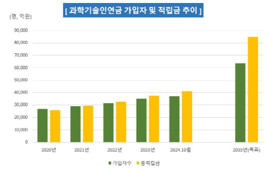 한편, 올해로 사업시행 20년을 맞은 과학기술인연금은 지난 10월 말 기준 약 3만7000명의 과학기술인이 가입 중인 것으로 집계됐다. 총 적립금은 약 4조1420억 원이다. 지난해 연금 운용수익률은 5.44%였으며, 지난 10년간 연평균 수익률은 5.29%를 기록했다.
