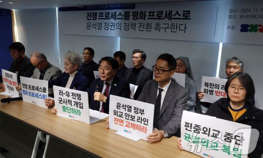 (서울=뉴스1) 김명섭 기자 = 12일 서울 중구 한국YWCA연합회에서 열린 한반도 평화행동의 한반도 위기 해소를 위한 시국 기자회견 '전쟁 프로세스를 평화 프로세스로! 윤석열 정권의 정책 전환을 촉구한다'에서 참석자들이 발언을 하고 있다. 2024.11.12/뉴스1
