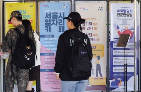 10월 취업자 수 증가폭이 4개월 만에 10만명 아래로 떨어졌다. 사진은 서울시 일자리 카페에서 구직 정보를 보고 있는 취업준비생 [연합] |