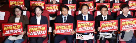 (서울=뉴스1) 김민지 기자 = 더불어민주당·조국혁신당·진보당·기본소득당·사회민주당 등 야5당 의원들이 13일 오전 서울 여의도 국회 의원회관에서 열린 '윤석열 탄핵 국회의원연대 발족식'에서 윤석열 대통령 탄핵을 촉구하는 규탄 손피켓을 들고 구호를 외치고 있다. 2024.11.13/뉴스1
