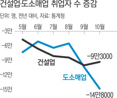 내수와 밀접한 도소매업과 건설업에서 취업자가 줄며 지난달 전체 취업자 수 증가 폭이 넉 달 만에 10만명을 밑돌았다. 정부는 고용률 등 주요 지표가 양호한 모습을 이어가고 있다고 강조했지만, 청년층 고용률은 오히려 뒷걸음질쳤다. 구직활동을 하지 않고 쉬는 인구도 역대 10월 중 가장 많았다.