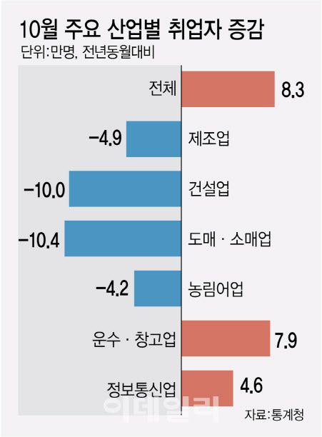 정부 관계자는 “취업자 수가 크게 늘은 작년 10월의 기저효과에 업종별 특이요인이 반영되면서 올 10월 취업자 수 증가폭이 줄었다”며 “도소매업 등은 전자상거래화, 무인화, 점포대형화가 심화하는 구조적인 문제로 고용감소가 있을 수밖에 없다”고 했다. 그러면서 “건설업 고용부진도 완화될 것”이라며 “내수 회복 조짐은 분명히 있다”고 했다.