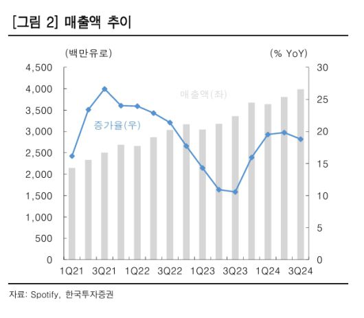 이성원 한국투자증권 연구원은 "스포티파이의 3분기 매출액은 39억9000만 유로로 가이던스와 컨센서스를 소폭 하회했다"며 "총매출이익률과 영업이익은 각각 31.1%, 4억5000만 유로를 기록하면서 시장 기대치를 상회했다"고 했다.