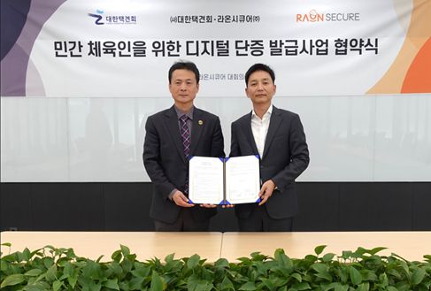 라온시큐어와 대한택견회가 디지털 단증을 위한 업무협약을 체결했다. (왼쪽부터)오성근 대한택견회 사무처장, 박종문 라온시큐어 서비스사업본부장. 라온시큐어 제공 |