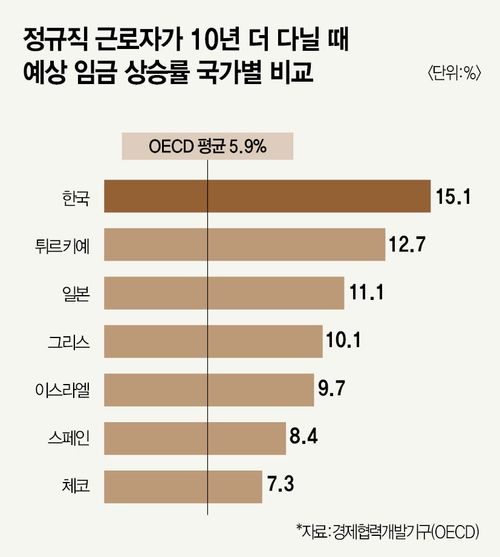 특히 경제협력개발기구(OECD) 국가 중 연공(근무 기간) 상승으로 인한 임금 인상 효과가 가장 큰 나라는 한국인 것으로 나타났다. OECD 조사에 따르면, 10년 차 정규직 근로자의 향후 10년간 예상 임금 상승률은 한국이 15.1%로 관련 수치가 집계된 27개국 중 가장 높다.