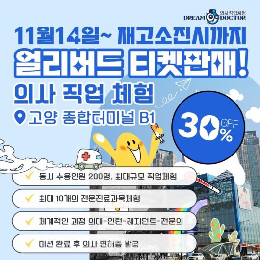 [문화뉴스 이용훈 기자] 드림닥터가 다음달 14일 일산 고양종합터미널에서 개최하는 '의사직업체험전' 티켓을 놀이의 발견 플랫폼에서 30% 할인된 얼리버드 가격으로 판매한다고 밝혔다.
