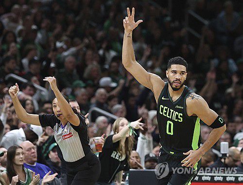 (서울=연합뉴스) 이의진 기자 = 미국 국가대표 포워드 제이슨 테이텀이 경기 종료와 함께 장거리 고난도 3점을 적중해 미국프로농구(NBA) 보스턴 셀틱스에 귀중한 승리를 안겼다.