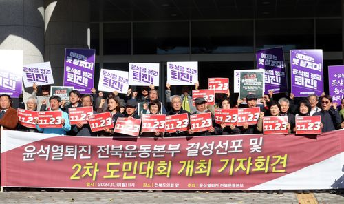 전북민중행동, 전북비상시국회의, 전북교육연대, 전북민주화운동기념사업회 등 60여개 단체는 18일 전북도의회 앞에서 '윤석열 퇴진 전북운동본부 결성선포' 기자회견을 열었다.