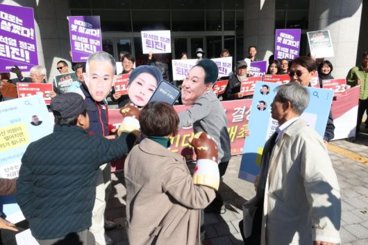 이들은 퇴진 의미를 담아 윤 대통령과 김건희 여사 사진에게 주먹을 날리는 퍼포먼스를 보였다.