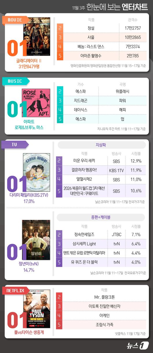◇ 영화='글래디에이터 Ⅱ' 1위(영화진흥위원회 영화관 입장권 통합 전산망 2024년 11월 15~17일)