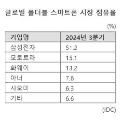 19일 시장조사기관 IDC에 따르면 삼성전자는 올해 3·4분기 글로벌 폴더블폰 시장에서 점유율 51.2%를 기록했다. 전 세계에서 판매된 폴더블폰 2대 중 1대가 삼성전자 제품인 셈이다. 올 하반기 '갤럭시Z폴드6·Z플립6' 출시 효과를 본 것으로 풀이된다. 2위 모토로라(15.1%)와는 36.1%p 격차가 난다. 3~5위는 화웨이(13.2%), 아너(7.6%), 샤오미(6.3%)가 각각 이름을 올렸다. 지난 2·4분기 16.4%에 그쳤던 삼성전자의 점유율은 3배 이상 대폭 확대됐다. 반면 화웨이는 2·4분기(27.5%) 대비 점유율이 반토막나며 1위에서 2계단 밀려났다. 중국 업체들의 부진은 예상보다 저조한 내수 판매 영향이 큰 것으로 분석됐다. 올해 3·4분기 중국에서 판매된 폴더블폰은 223만대(IDC 기준)로, 전년 대비 13.6% 성장하는데 그쳤다. 2023년 연간 출하량이 전년 대비 114% 이상 증가한 것과 비교해 성장률이 급격히 축소됐다. 외신에선 오포, 트랜션, 비보 등 일부 중국 스마트폰 제조사들이 폴더블폰 시장에서 철수할 수 있다는 전망까지 내놓고 있다.