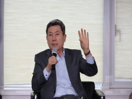 이강덕 포항시장이 19일 시청 브리핑룸에서 기자 간담회를 갖고 있다. 포항시 제공 |