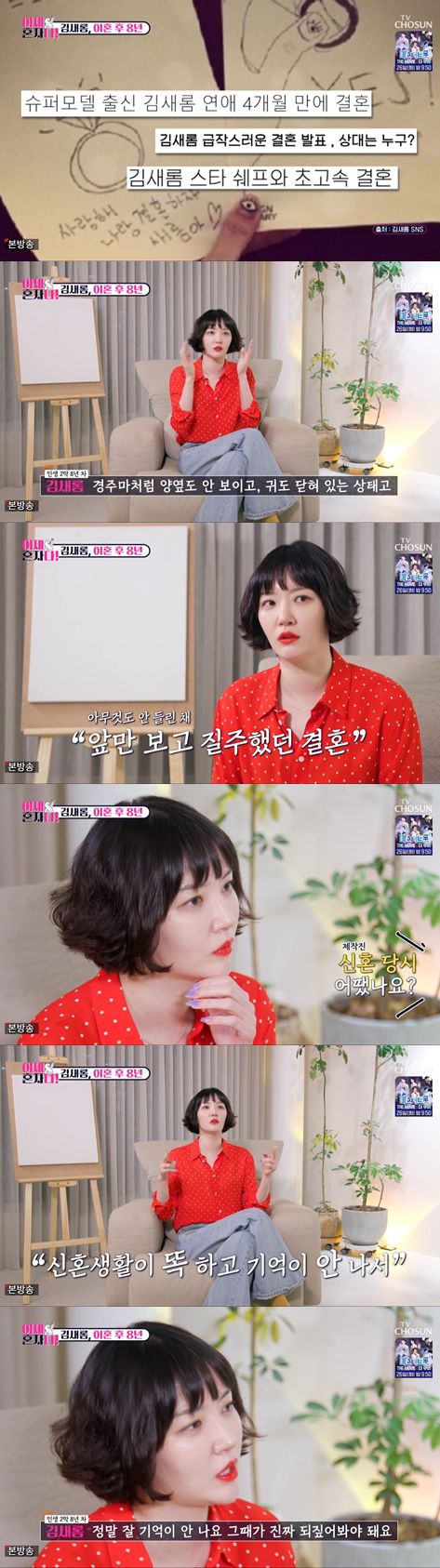 김새롬은 신혼 당시는 어땠냐는 질문에 대해서는 "정말 기억이 안 나서 잘 되짚어봐야 한다"라고 답했다.