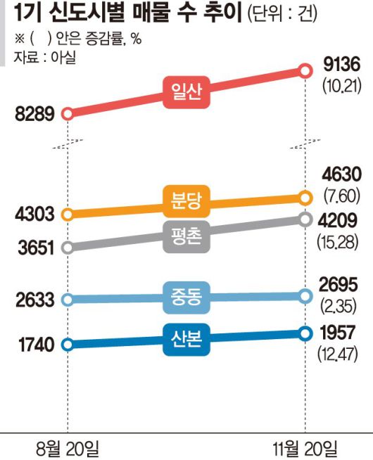다른 1기 신도시도 비슷한 흐름이다. 경기 고양시 일산의 매물은 8200여건에서 9100여건으로 10.2% 증가했다. 일산은 허용 용적률이 300%로 중동(350%), 평촌·산본(330%), 분당(326%)보다 낮아 사업성에서 다른 지역보다 불리하다. 11월 셋째 주 일산동구와 일산서구의 아파트값도 각각 0.01%, 0.03% 내리며 기대감 약화가 가격 하락으로 이어졌다. 현재 일산 지역 주민들은 고양시에 기준 용적률 상향 및 정비기본계획 수정을 촉구하고 있다.