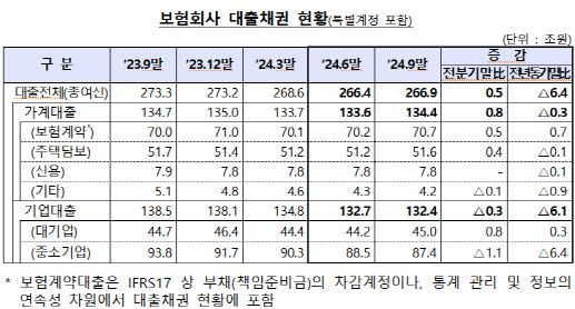 22일 금융감독원이 발표한 ‘9월말 보험회사 대출채권 현황’에 따르면 보험회사 대춫채권 잔액은 266조9000억원으로 전분기 말보다 5000억원 증가했다. 가계대출 채권은 134조4000억원으로 8000억원 늘어난 반면, 기업대출 채권은 132조4000억원으로 3000억원 줄었다.