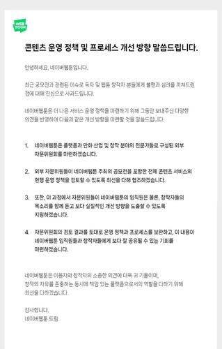 그러면서 "플랫폼과 만화 산업 및 창작 분야 전문가들로 구성된 외부 자문위원회를 마련하겠다"며 "자문위원이 공모전을 포함한 전체 콘텐츠 서비스의 현행 운영 정책을 검토할 수 있도록 협조하겠다"고 말했다.