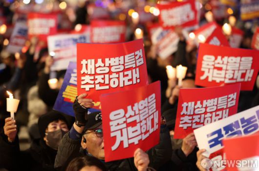 [서울=뉴스핌] 정일구 기자 = 23일 오후 서울 종로구 광화문광장 인근에서 시민사회 연대 주최로 열린 '윤석열을 거부한다 2차 시민행진'에서 참가자들이 구호를 외치고 있다. 2024.11.23 mironj19@newspim.com