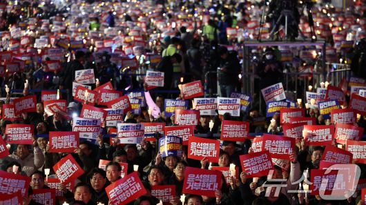 (서울=뉴스1) 김도우 기자 = 23일 서울 광화문광장 앞 도로에서 열린 '김건희·윤석열 국정농단 규탄·특검 촉구 제4차 국민행동의 날'집회에서 참석자들이 구호를 외치고 있다. 2024.11.23/뉴스1