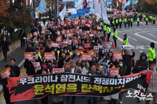 23일 오후 서울 중구 태평로 일대에서 열린 '윤석열 정권 퇴진 및 특검 촉구 집회' 참석자들이 행진을 하고 있다.