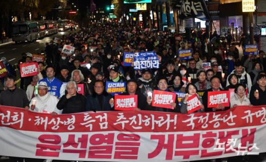 23일 오후 서울 종로구 광화문 북측광장 인근에서 열린 '김건희·윤석열 국정농단 규탄·특검 촉구 제4차 국민행동의 날' 집회 참석자들이 행진을 하고 있다.저작권자 © CBS 노컷뉴스 무단전재 및 재배포 금지