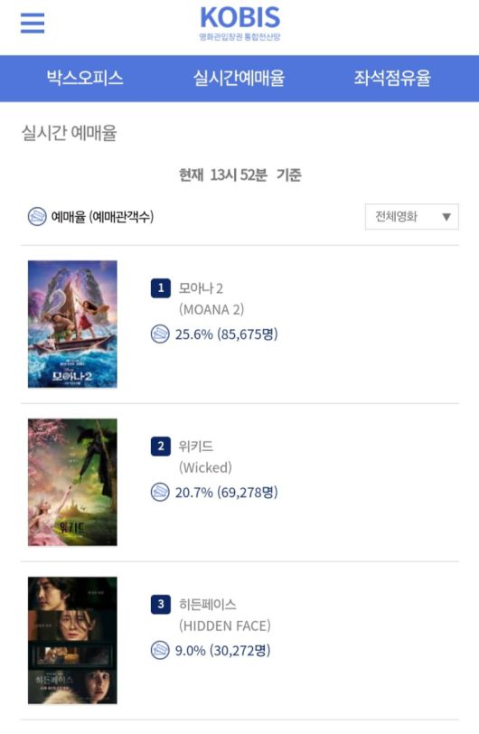 전 세계가 기다려온 웰메이드 애니메이션 ‘모아나 2’가 개봉을 3일 앞둔 24일 전체 예매율 1위에 올랐다. 영화관입장권 통합전산망에 따르면 ‘모아나 2’는 24 오후 1시52분 기준, 사전 예매 8만5675장을 기록하며 동시기 경쟁작인 ‘위키드’, ‘히든페이스’, ‘글래이데이터 2’를 모두 뛰어넘고 전체 예매율 1위에 올랐다.