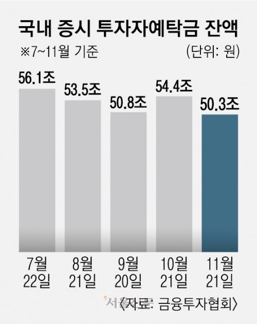 24일 금융투자협회 채권정보센터에 따르면 지난 21일 기준 코스피·코스닥 시장의 투자자예탁금 잔액은 50조 3096억원을 기록했다. 주식 매수를 위한 대기성 자금 성격의 투자자예탁금은 국내 주식 투자 열기를 가늠하는 지표다. 투자자예탁금은 전날인 20일(49조 8128억원)과 19일(49조 9928억원)에는 50조원을 밑돌기도 했다. 올해 1월 2일(59조 4949억원)과 비교하면 9조원 넘게 빠진 셈이다.