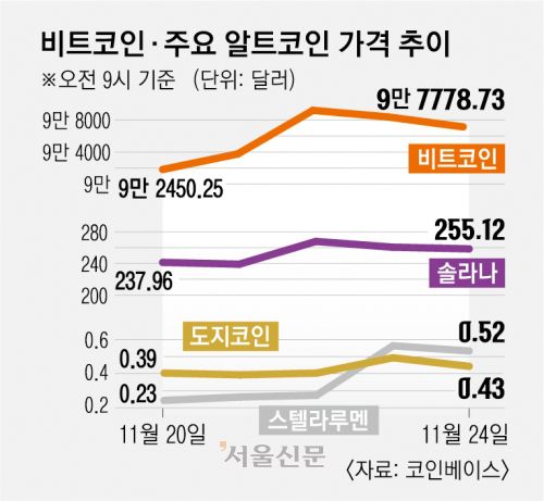 반면 가상자산 투자는 과열 양상을 보이고 있다. 전날 오후 6시 기준 국내 5대 가상자산 거래소(업비트·빗썸·코인원·코빗·고팍스)의 24시간 거래 규모는 25조 3200억원에 달했다. 지난 22일 코스피 시장(8조 171억원)과 코스닥 시장(7조 9967억원) 거래 규모를 합한 것보다 10조원 가까이 많은 액수다. 가상자산 대장주인 비트코인은 전날 한때 9만 9800달러까지 상승하며 10만 달러 돌파를 눈앞에 두고 있다.
