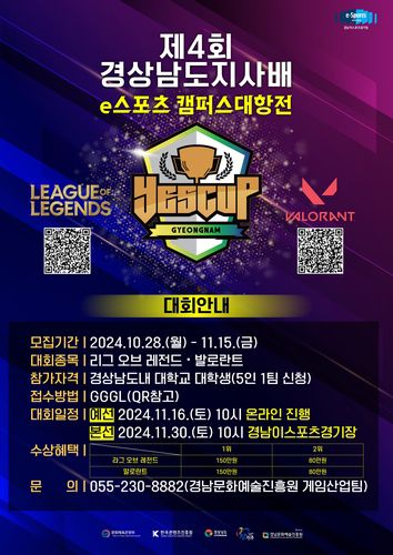 (창원=연합뉴스) 이정훈 기자 = 경남도는 오는 30일 경상국립대학교 내 경남e스포츠상설경기장에서 도지사배 e스포츠 캠퍼스 대항전, e스포츠 특별대전을 동시 개최한다고 25일 밝혔다.