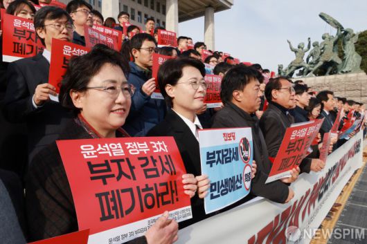 [서울=뉴스핌] 이형석 기자 = 25일 오후 서울 여의도 국회 본청 앞 계단에서 부자감세 거부 민생복지 예산 확충 야4당 및 노동·시민사회 단체 기자회견이 열리고 있다. 2024.11.25 leehs@newspim.com