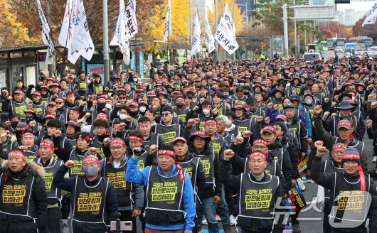 (서울=뉴스1) 장수영 기자 = 민주노총 공공운수노조 화물연대본부 조합원들이 25일 오후 서울 여의도 국회 앞에서 '화물연대 집중투쟁, 국회 진격의 날' 집회를 갖고 안전운임제 확대 입법을 촉구하고 있다. 2024.11.25/뉴스1