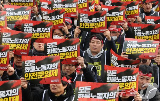 (서울=뉴스1) 장수영 기자 = 민주노총 공공운수노조 화물연대본부 조합원들이 25일 오후 서울 여의도 국회 앞에서 '화물연대 집중투쟁, 국회 진격의 날' 집회를 갖고 안전운임제 확대 입법을 촉구하고 있다. 2024.11.25/뉴스1presy@news1.krCopyright ⓒ 뉴스1. All rights reserved. 무단 전재 및 재배포, AI학습 이용 금지.