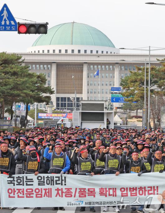 (서울=뉴스1) 장수영 기자 = 민주노총 공공운수노조 화물연대본부 조합원들이 25일 오후 서울 여의도 국회 앞에서 '화물연대 집중투쟁, 국회 진격의 날' 집회를 갖고 국민의힘 당사 방향으로 행진하고 있다. 2024.11.25/뉴스1