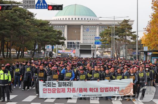 (서울=뉴스1) 장수영 기자 = 민주노총 공공운수노조 화물연대본부 조합원들이 25일 오후 서울 여의도 국회 앞에서 '화물연대 집중투쟁, 국회 진격의 날' 집회를 갖고 국민의힘 당사 방향으로 행진하고 있다. 2024.11.25/뉴스1