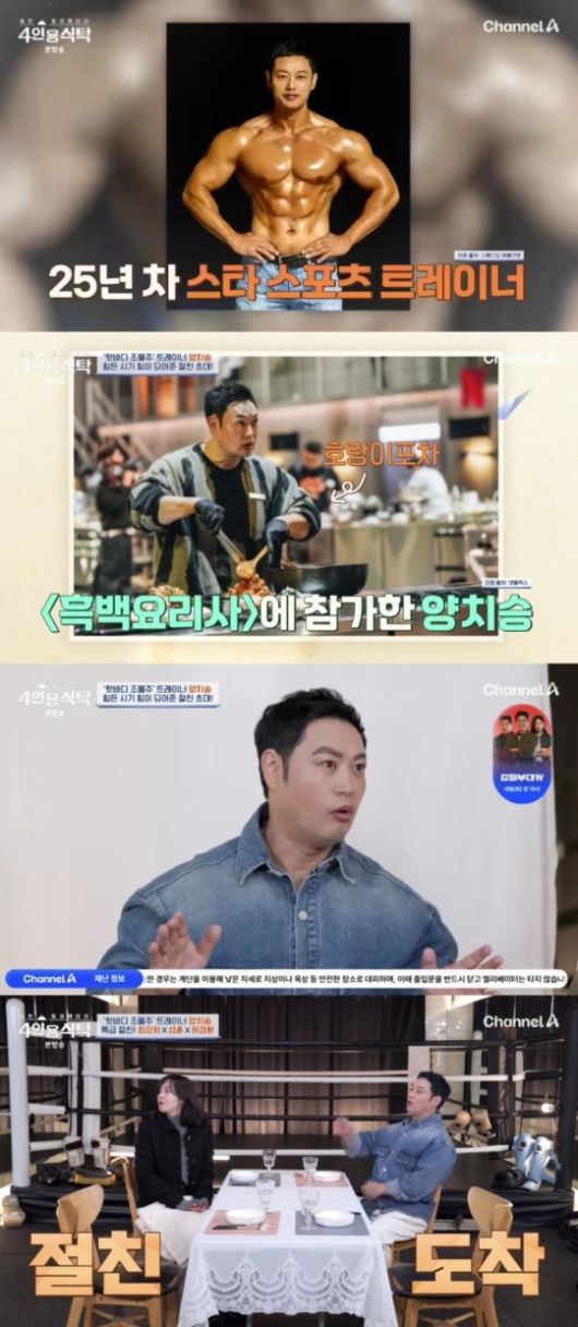 25일 방송된 채널A '절친 토큐멘터리 4인용 식탁'에서는 양치승이 최강희, 성훈, 허경환을 초대한 모습이 그려졌다.