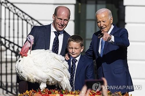 (워싱턴=연합뉴스) 조준형 특파원 = 조 바이든 미국 대통령은 25일(현지시간) 재임 중 마지막 추수감사절 칠면조 사면 행사를 주재하면서 "내 평생의 영광이었다. 영원히 감사할 것"이라며 4년 가까운 백악관 생활을 회고했다.