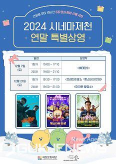 이번 '2024 시네마제천 연말 특별상영'은 시민들에게 영화가 함께하는 특별한 연말연시를 선물하고자 마련되었으며, 추운 날씨에 가족과 함께 보기 좋은 화끈한 액션영화와 따듯한 코미디 영화들이 준비됐다.