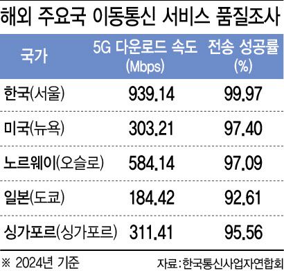 조사에 따르면, 국내 통신 3사의 평균 5G 다운로드 속도는 939.14Mbps로, 한국, 미국, 노르웨이, 일본, 싱가포르 등 7개 주요 국가의 평균 다운로드 속도 331.21Mbps보다 2.8배 빠른 것으로 나타났다.