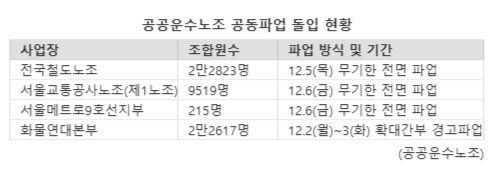 철도노조는 지난 18일부터 준법투쟁(태업)에 시작한 데 이어 오는 12월 5일부터 무기한 총파업에 돌입한다. 서울교통공사 제1노조는 20일부터 태업을 이어가고 있으며, 사측과 협상이 결렬될 경우 12월 6일부터 총파업에 들어간다. 서울메트로9호선지부 노조는 이달 28일 경고 파업을 진행한 뒤 12월 6일부터 무기한 총파업을 시작한다.