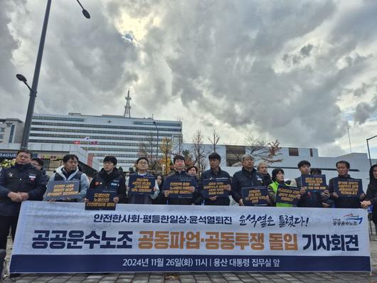 공공운수노조는 26일 오전 서울 용산구 대통령실 앞에서 '공동파업-공동투쟁 돌입' 기자회견을 열고, 다음 달 5일부터 공공운수노조 산하 4개 사업장의 노동자 약 7만명이 공동파업에 돌입한다고 밝혔다.