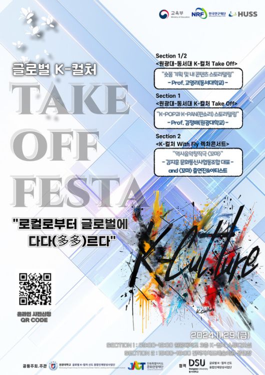 '테이크오프페스타'는 인문사회융합인재양성사업(HUSS) 글로벌 K-컬처 컨소시엄 참여 대학과 더불어 참여대학이 속한 지역인 전북자치도 익산, 충남 천안, 경기 이천, 충남 서산, 부산 지역의 문화단체가 상호 기관의 전문성을 연결하고, 글로벌 K-컬처 가치를 제고하기 위한 통합 비교과 프로그램으로, 3주에 걸쳐 펼쳐진다.