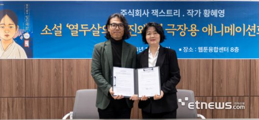 이원철 잭스트리 대표(왼쪽)와 황혜영 작가가 애니메이션 제작 계약을 체결했다. |