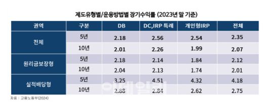 권 연구위원은 중소기업 퇴직연금기금인 ‘푸른씨앗’의 경우 올해 8월 기준 연간 수익률이 7.34%로 시장수익률과 유사한 수익률을 기록했고 관리수수료 인하 등 부수적인 효과도 거두고 있다고 설명했다. 2023년 기준 전체 퇴직연금의 평균 수익률은 5.26%다,