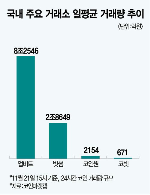 5대 거래소에서도 차이가 난다. 업계 1위 업비트가 압도적인 점유율을 자랑한다. 이를 2위인 빗썸이 뒤쫓는다. 업비트와 빗썸을 제외한 나머지 3곳은 존재감이 미미하다. 글로벌 가상자산 시장 분석 업체 코인게코에 따르면, 지난 11월 20일 기준 업비트가 국내 암호화폐 24시간 거래량에서 차지하는 비중은 74.8%에 달한다. 2위 사업자 빗썸(22.5%)보다 월등히 높다. 1·2위 사업자 거래 규모를 합치면 97%에 육박한다. 나머지 3곳 점유율은 3% 미만으로 사실상 시장에 미치는 영향이 미미하다.
